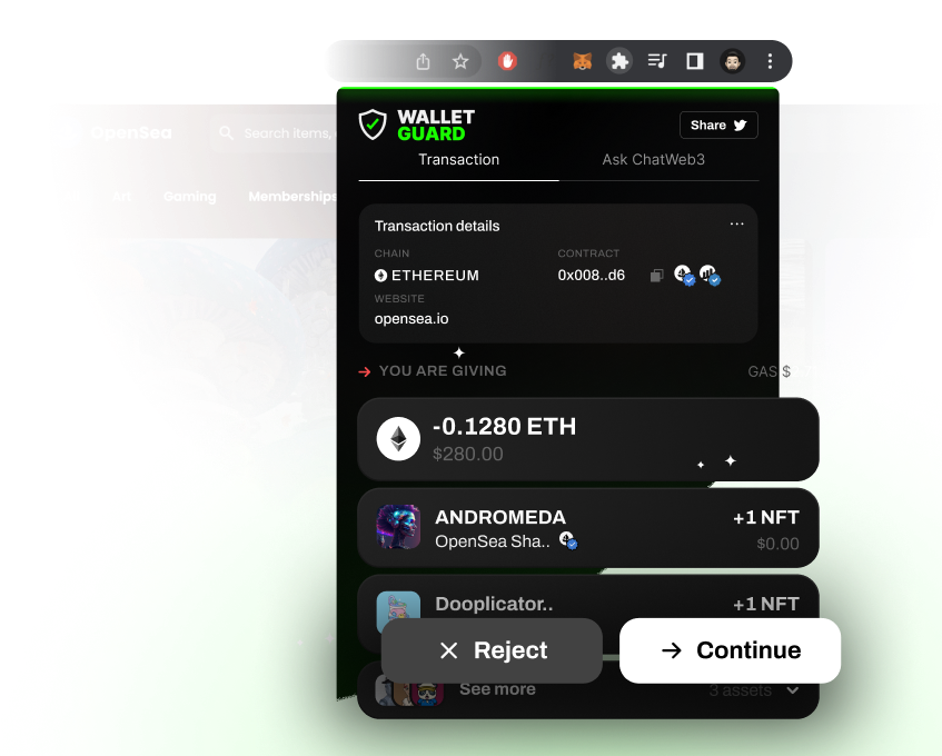 $40M+ assets saved from scams since June 2022Don’t become the next victim to a scammer. Protect your crypto with multi-layered defense including scam detection & human-readable transactions. Secure your [wallet assets] Wallet Guard is not a wallet; we help secure your wallet of choice from the latest threats in web3. Security Engineer at MetaMask Solutions Architect at Chainalysis Slide 1 of 3.